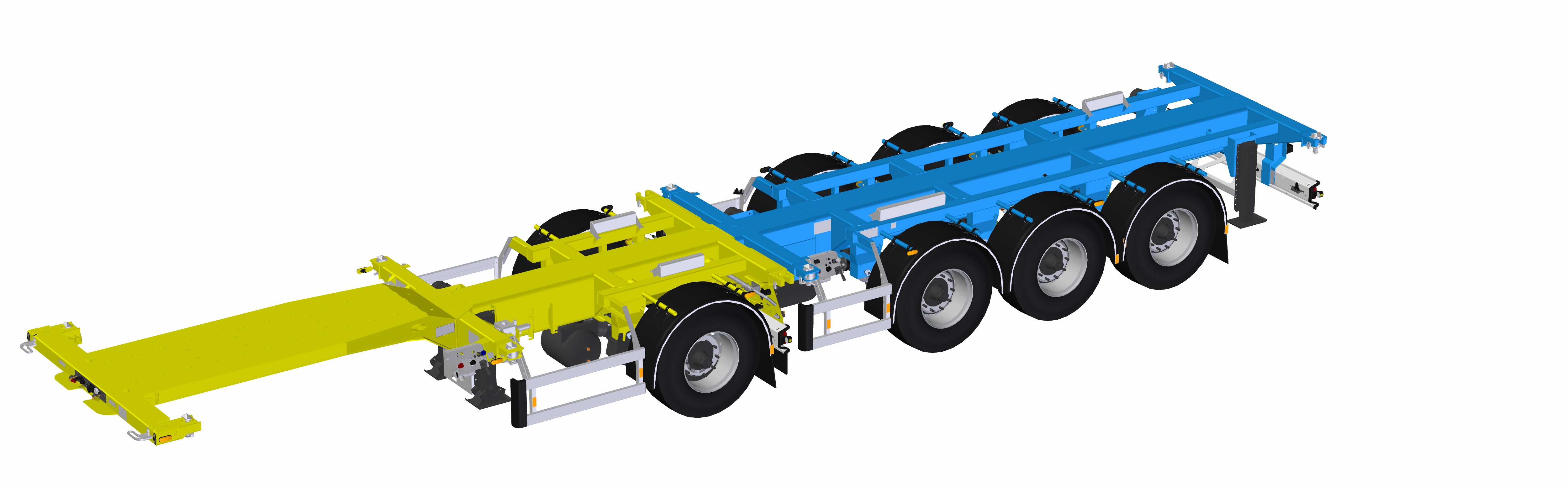The CT-43-04D has one fixed axle on the front chassis part. When both chassis parts are coupled you can drive with 3 axles on the road. The axle of the front part is permanently lifted when both chassis parts are coupled. Many customers choose for implementing the 4th axle as self steering axle. That extends the lifte time and reduces tyre wear. Optionally the 2nd and 4th axle are also lift axles. This gives the flexibility to transport unequally loaded containers.